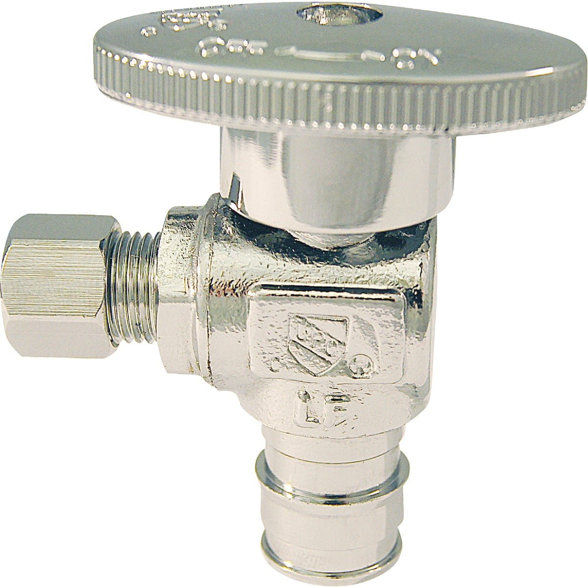 1/2 In. Expansion PEX A by Compression angle stop. Quarter turn on/off with easy turn tear drop handle. Compatible with Uponor (Wirsbo) ProPEX piping systems (ProPEX is a trademark of Uponor). Lead free chrome plated brass. For use with cold expansion PEX A pipe and sleeve system. ASTM F1960.